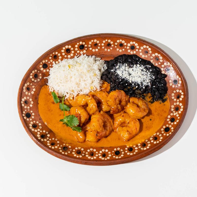 Shrimp sautéed and finished with tequila cream sauce and a dash of chile. Served with rice and black beans